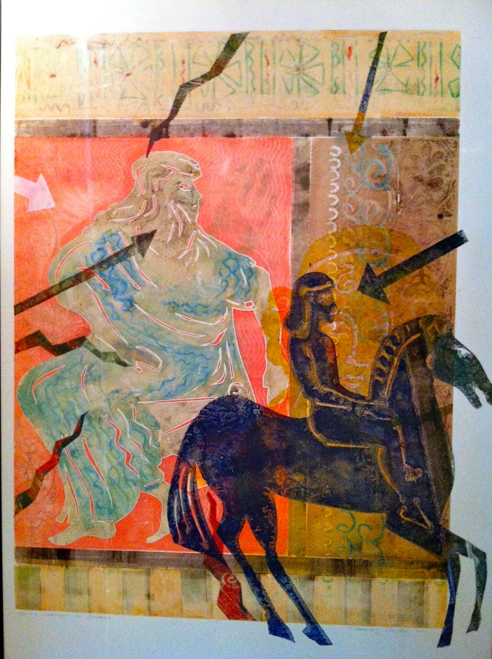 An art teacher at Harpeth Hall and Montgomery Bell Academy in Nashville and St. Andrew’s-Sewanee School in Sewanee, Tenn., South Africa native Rosie Paschall landed in Tennessee via England. Her earlier works focus on the complex colors, patterns and politics of her native country during the era of Apartheid. Her later work moved toward printmaking. The monoprint pictured here (“Orestes,” 2000) is from the Divine Messengers series of prints celebrating Greek gods and heroes.