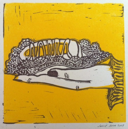 Self-taught printmaker Julie Sola draws on her work experiences at Nashville landmarks Hatch Show Print and bygone American Artisan gallery to create whimsical designs of bold color, often filled with primitive images of birds, animals, people and food. Sola translates her designs to two-dimensional media including fabric and children’s book illustrations. Sola sells her Fat Crow Press artwork through Etsy and her fabrics and wallpapers through Spoonflower.com.